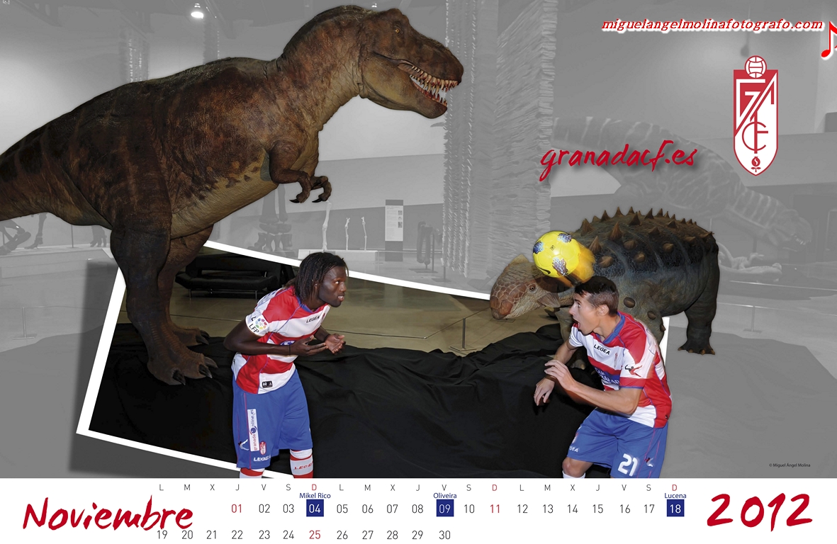 GR01.GRANADA,21/12/11.- Este jueves se presenta a la afición Granadina el Calendario Oficial del Granada cf 2012 realizado en el parque de las ciencias de Granada. En la imagen diakaté y David cortes junto a un Tironosaurus Rex.